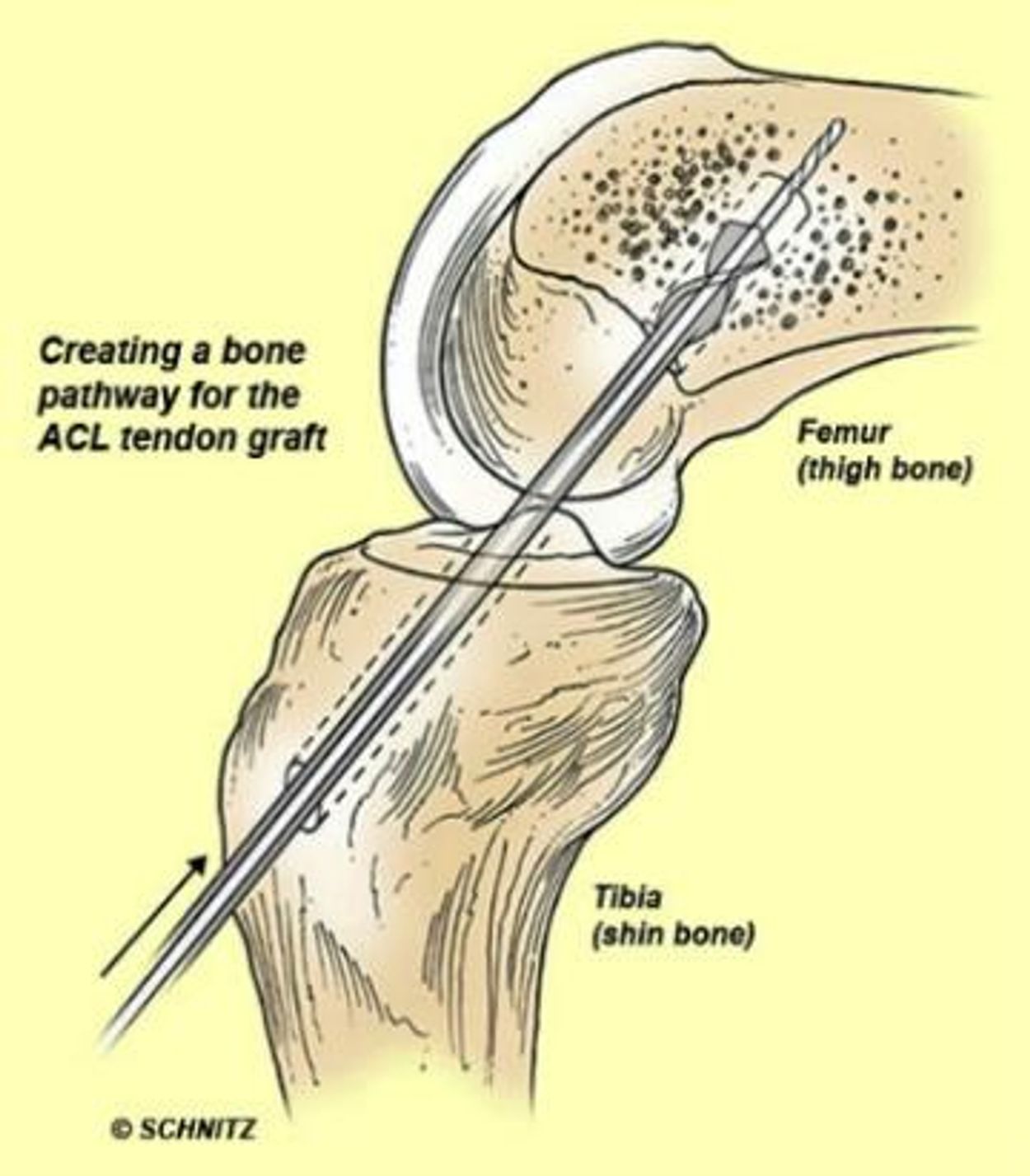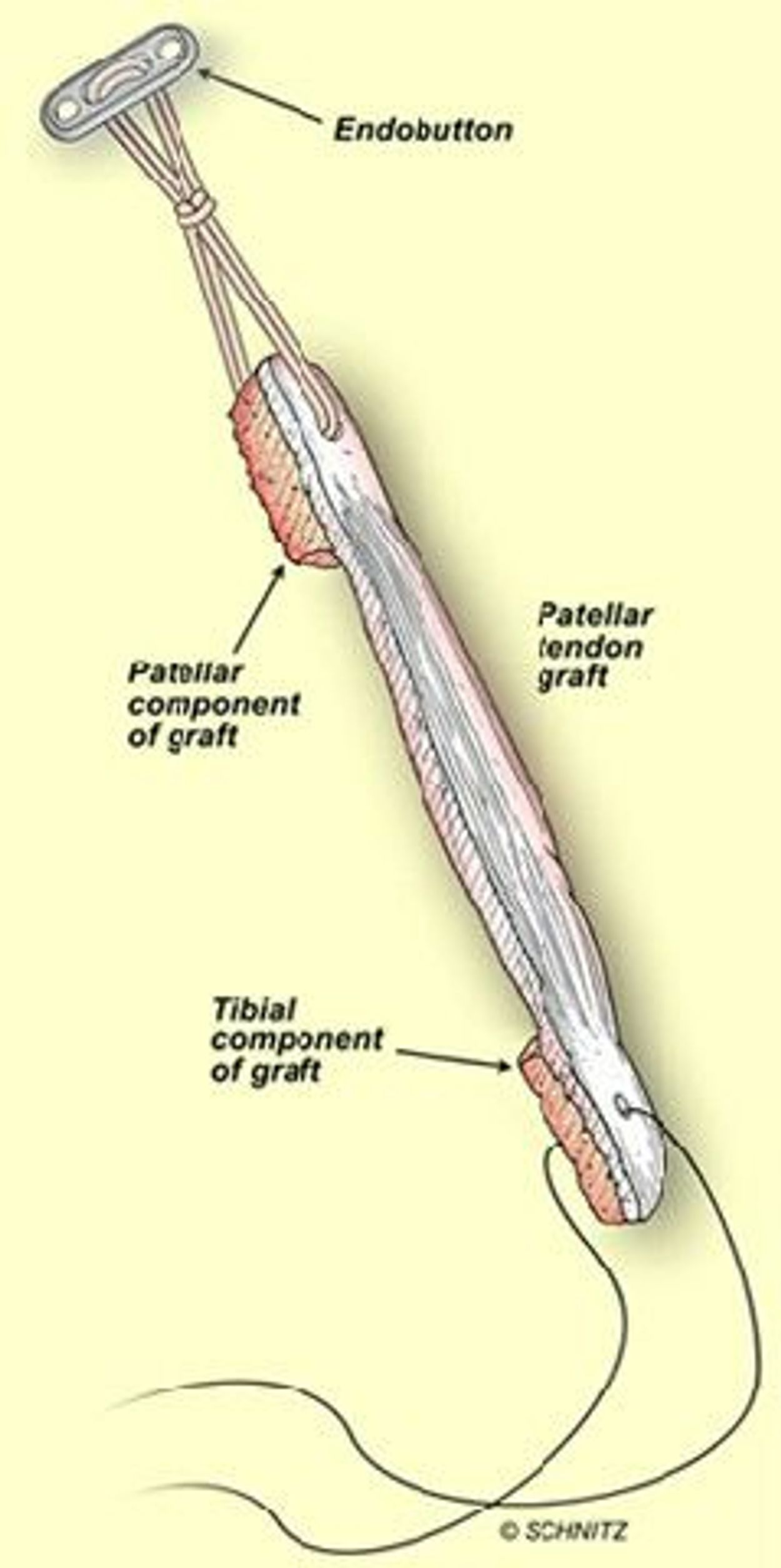 During surgery the one-piece bone and tendon graft (as seen on the left) will be surgically anchored inside of the knee joint in a location similar to the patient's original anterior cruciate ligament. This will help insure that the knee joint will have stability postoperatively. During surgery the bone tunnels (holes) within the tibia and femur are created arthroscopically with small skin incisions, creating bone pathways for the insertion of the new tendon graft.