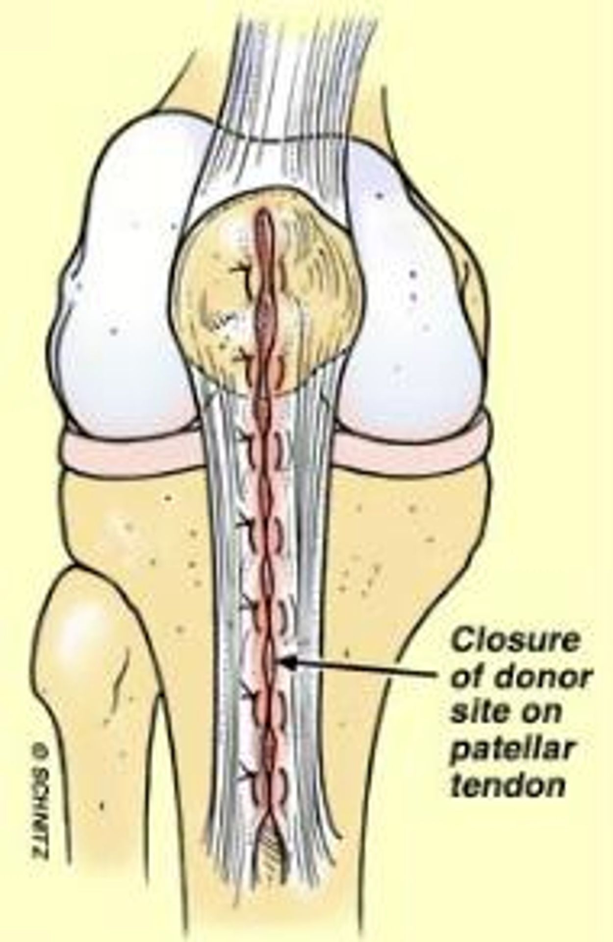The original incision on the patellar tendon is closed with sutures. Recovery time for this type of surgery may take several months.